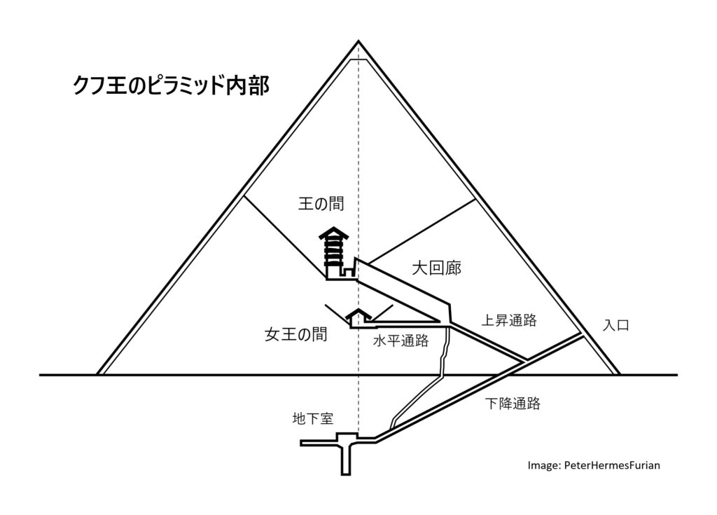ピラミッドの主な材料である石灰岩の巨石は、当然ながら下から積み上げられていきます。その途中では、完成形の美しい三角形のシルエットではなく、平たい台形のようなシルエットだった時期もあったはずです。それを前提に、クフ王のピラミッドの内部構造を見ていると、あることに気づきます。「王の間」と呼ばれる、王の玄室とされる部屋の下に、「女王の間」と呼ばれるやや小さめの部屋があります。そこに通じる通路は、クフ王のピラミッドにしては珍しく、水平なのです。そして、その水平通路は、「大回廊」の下端から、大回廊の下にもぐるような方向に向かって伸びています。つまり、大回廊の下端の床面に穴が開いたようになっていて、そこからまっすぐ「女王の間」に通じているのです。一見、不思議な構造です。